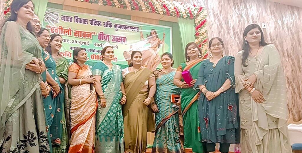 मुजफ्फरनगर। भारत विकास परिषद् शक्ति शाखा के तत्वावधान में मंगलवार रात्रि गांधी काॅलोनी स्थित एक रेस्टोरेंट में हरियाली तीज उत्सव अत्यंत हर्षोल्लास और धूमधाम के साथ मनाया गया। कार्यक्रम में शाखा के सभी सम्मानित सदस्यों ने सपरिवार भाग लिया और उत्सव को उल्लासपूर्ण बना दिया। कार्यक्रम का भव्य संचालन डा. रूचि शर्मा एवं प्रीति शर्मा ने बेहद शानदार तरीके से किया। कार्यक्रम की शुरुआत भारत माता एवं स्वामी विवेकानंद की प्रतिमा के समक्ष दीप प्रज्वलन एवं वंदे मातरम गीत के साथ की गई। कार्यक्रम में महिलाओं द्वारा एकल एवं कपल प्रस्तुतियां, बच्चों के लिए गेम्स, कपल गेम, भजन संध्या और मैजिक ट्रिक्स की शानदार प्रस्तुतियां दी गईं, जिनसे आयोजन और अधिक भव्य एवं मनोरंजक बन गया। श्रृंगार प्रतियोगिता का आयोजन भी उत्सव का विशेष आकर्षण रहा, जिसमें अनीता हुड्डा विजेता रही। कार्यक्रम के अंत में उपस्थित सभी महिला सदस्यों को तीज के उपहार भेंट किए गए। इस अवसर पर शाखा संरक्षक विशाल शर्मा, शाखा अध्यक्ष निर्वेश हुड्डा, एडवोकेट मोहित कुमार संगल, प्रांतीय संयोजक सचिव राजीव मित्तल, कोषाध्यक्ष संजीव अग्रवाल, अमित सिंघल, रविंद्र वाशिष्ठ, सार्थक शर्मा, नरेश अग्रवाल, विनय राजवंशी, निखिलेश गौड़, कुमार गौरव, पवन शर्मा, रमिता अग्रवाल, डा. रश्मि संगल, स्वाति अग्रवाल, वर्षा राजवंशी, वीनस गौड़, इंदु अग्रवाल, दुर्गेश नंदिनी सहित अन्य अनेक सदस्य उपस्थित रहे।